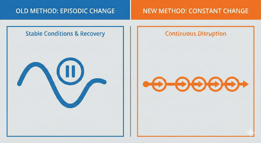 Organizations operated in stable conditions punctuated by periods of transformation. A system was implemented. A process redesigned. A reorganization completed. Disruption followed, but eventually, things settled. People adapted. Performance stabilized. Confidence returned.