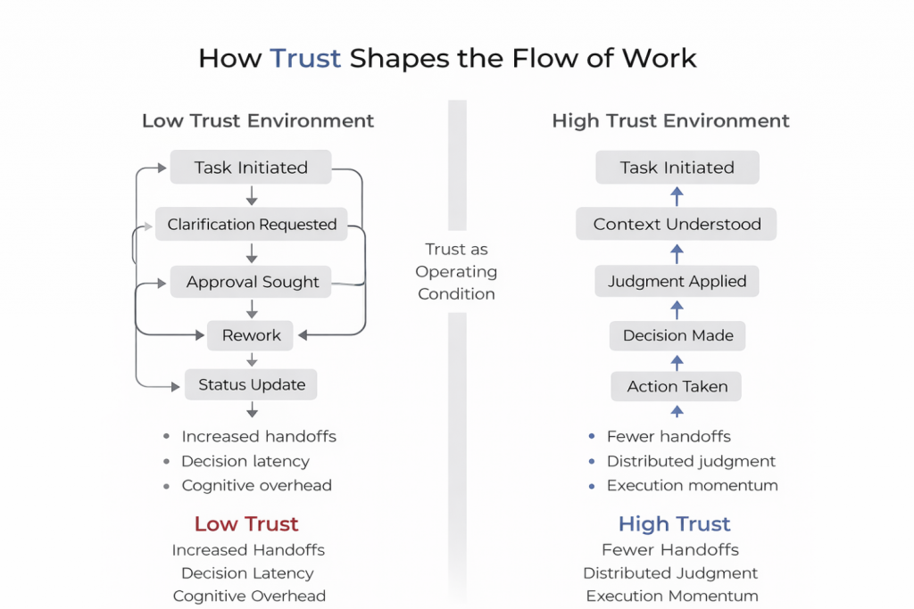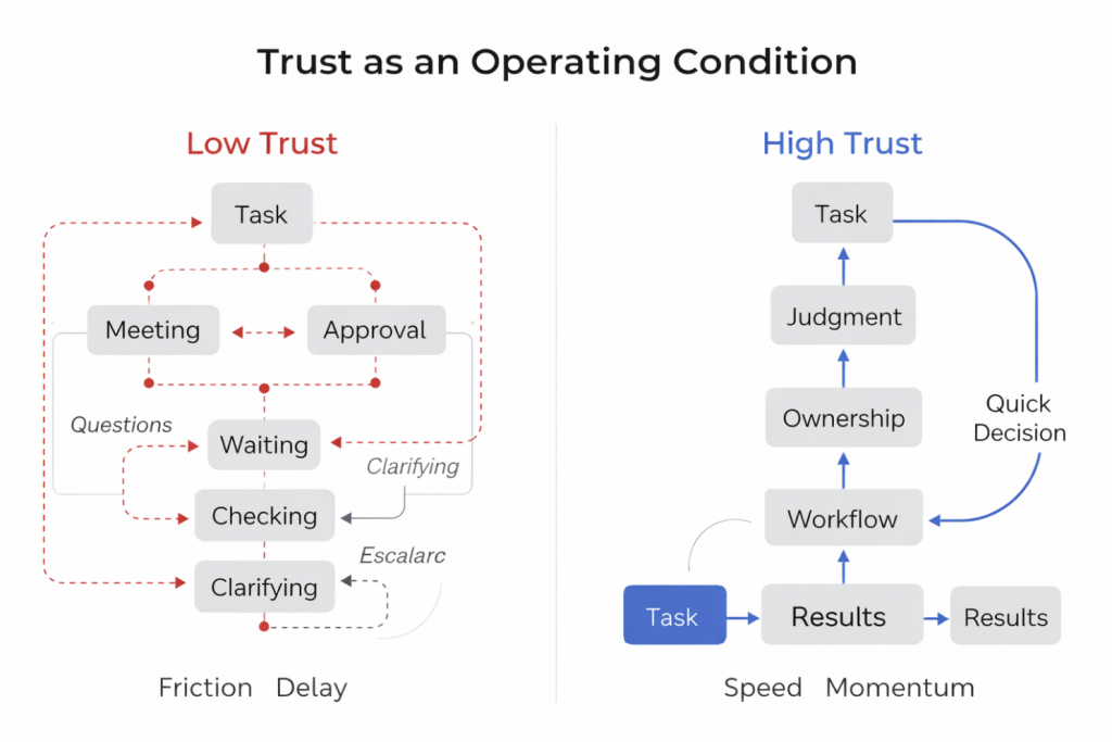 This distinction matters because most organizational friction is not technical. It is human. It lives in hesitation, second-guessing, rework, approvals, escalations, and silence. Trust is the variable that determines whether that friction compounds or dissolves.