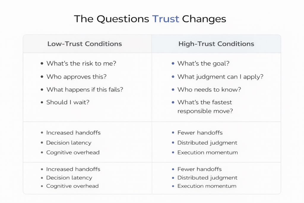 Trust is the condition that determines how people process information, assess risk, decide what to say and what to withhold, and when to act. It shapes whether people engage or protect, whether they move quickly or slow things down, whether they coordinate fluidly or rely on process and permission. Long before trust appears in survey scores or engagement metrics, it appears in behavior. It manifests in how people ask questions, how early problems surface, and how much effort is spent managing risk rather than creating value.